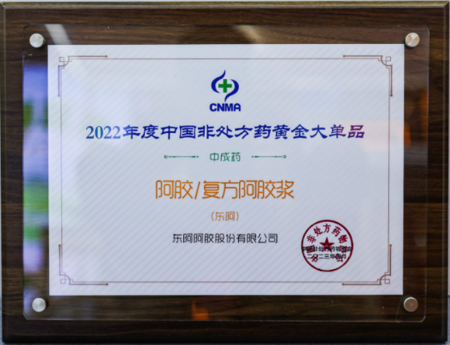會(huì)上,東阿阿膠及旗下明星產(chǎn)品攬獲5項(xiàng)大獎(jiǎng),其中阿膠和復(fù)方阿膠漿以突出的品牌力、創(chuàng)新的產(chǎn)品力以及深刻的營銷力榮獲“2022年度中國非處方藥產(chǎn)品綜合統(tǒng)計(jì)排名(中成藥)第一名”、“2022年度中國非處方藥黃金大單品”。